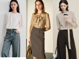 夜が長くなる秋に備え、シルクタッチのブラウスで一段と上品な装いを。シンプルながらも高級感あふれる素材で、秋の夜を特別に。