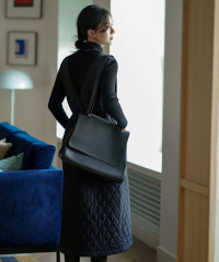 ジャストショルダーですっきり、アシンメトリーなフロントのデザインがシャープな印象です。グレーやホワイトと合わせるモノトーンコーデはもちろん、ブラックのインナーやレギンスと合わせ、ポイントになるカラーのバッグや靴を合わせる個性的なコーディネートもおすすめです。