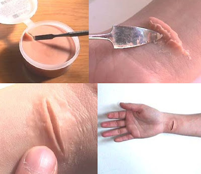 ■粉ゼラチン…スプーン2杯(スーパーにあるお菓子用でok)■グリセリン…スプーン2杯 ■水…スプーン2杯 。これらを耐熱容器に入れ軽く混ぜて電子レンジで20秒チン! 出来上がり☆ 熱いので本物の火傷には気をつけましょう。 でもすぐ乾いて固まるので混ぜて冷めたら手早く塗りましょう!