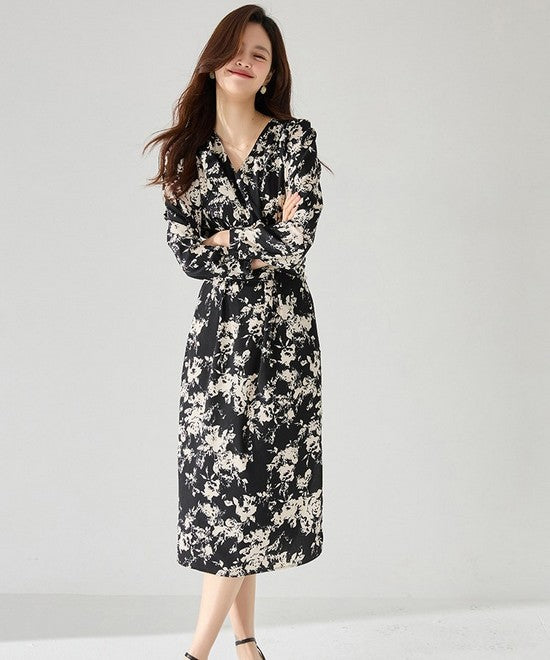 エレガントな艶を纏う、Vネック花柄ワンピース