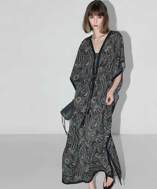 全体にあしらわれた繊細なレース模様と落ち着いたトーンのカラーが魅力のロングワンピ。深めのVネックで顔まわりをすっきり見せ、ウエストのドローストリングでシルエットの調整も自由自在。動くたびに揺れる裾が、大人の余裕と女性らしさを引き出してくれます。都会的なエスニックスタイルを楽しみたい人におすすめ。