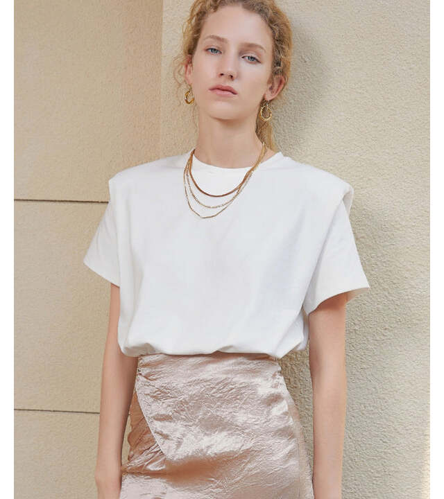 ショルダーラインが特徴的なデザインの白Tシャツは