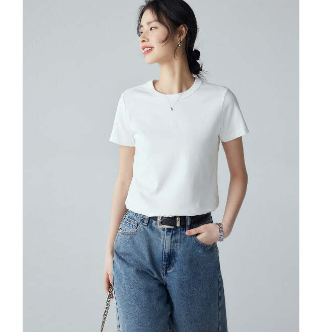 大人っぽいデニムコーデには、ラウンドネックの白Tシャツがマストです!