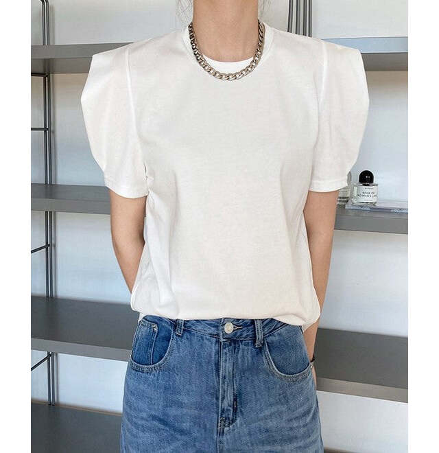 一見普通の白T?と思いきや、肩のゴールドボタンがアクセントになった1枚。ラフすぎるのは苦手な方でもきれいめに着こなすことが可能。トレンドのミニマルシルエットでどんなボトムスとも合わせやすいのも魅力です。