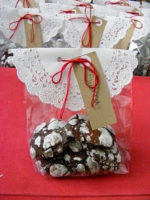 <材料>①透明袋 ②レースペーパー ③メッセージタグ ④赤い毛糸 <作り方>お菓子を入れた袋の入り口部分にレースペーパーを2つ折りにしてかぶせ、穴あけパンチで2カ所穴を空けます。そこに毛糸とメッセージタグを通して完成。