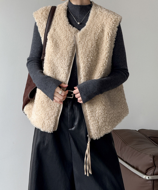 厚みのあるモコモコした毛並みの生地が、暖かくて柔らかな印象を与える「ノーカラーボアベスト」。羽織るだけで上半身にボリュームが出るため、下半身をすっきり見せることができます。インナーには、カジュアルな雰囲気のニットがおすすめ。ボトムスにインして、よりスタイル良く着こなしましょう。