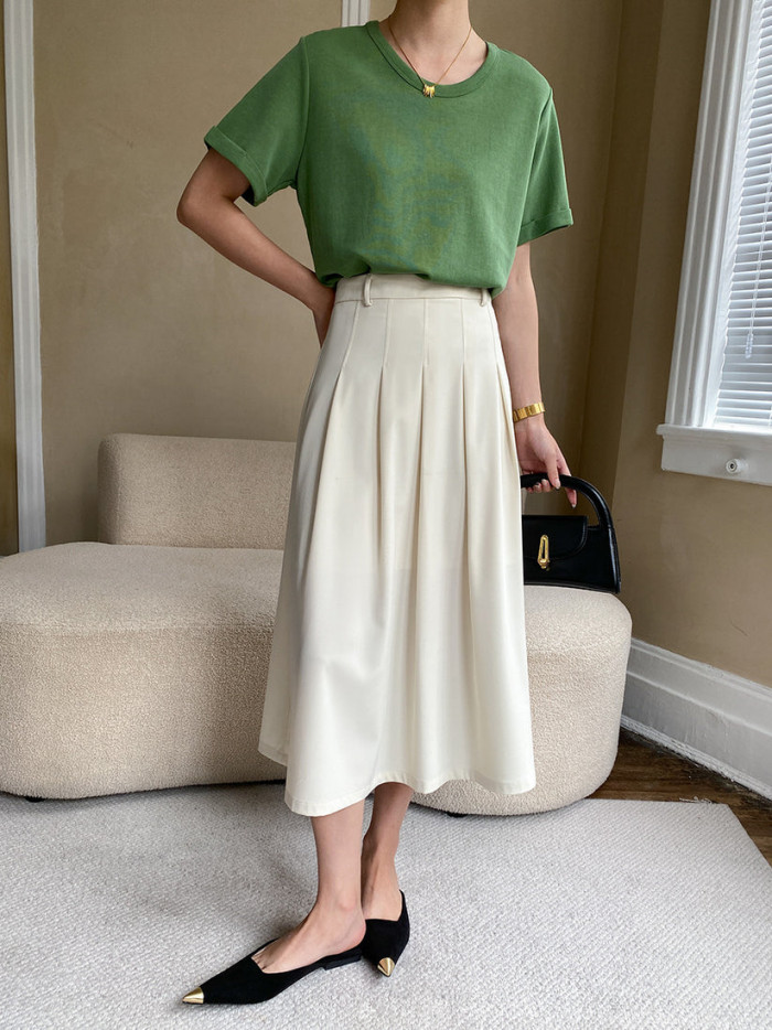 深みはありつつも鮮やかなグリーンカラーのTシャツ×女性らしさあふれる清潔感のあるホワイトのプリーツスカートのスタイリング。それだけでも大人っぽく気品あふれる配色ですが、小物には艶のあるブラックカラーを持ってくると、さらに高級感が演出できます。Tシャツのアイテムでカジュアルダウンさせます。