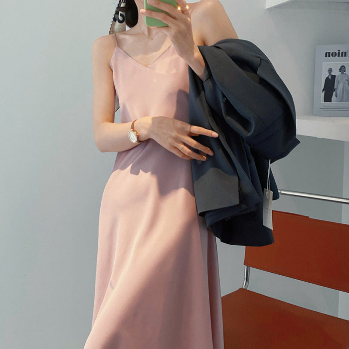 甘くて可愛らしいイメージのあるピンクの配色ですが、薄手の色味なのであっさりとした雰囲気で着用できるキャミワンピース。デコルテがより綺麗に見えるVネック型の襟ぐりで、インナーを着てもごたついた印象にはさせません。着用じわも綺麗なドレープに見える素材感なので、どこから見ても美しいです。