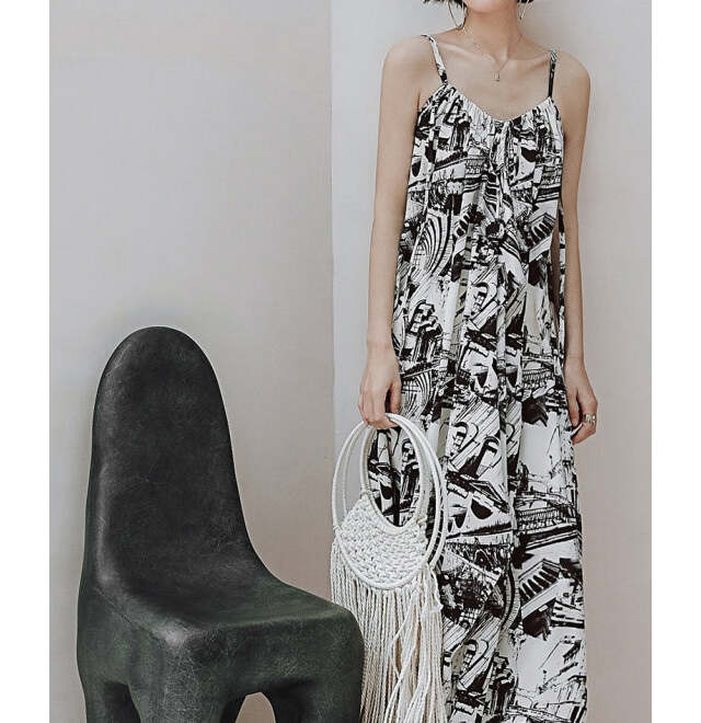 モノトーン調でもプリントで華やかに。プリントキャミワンピース