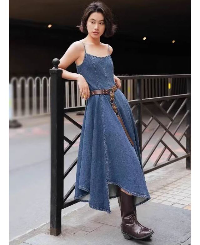 変形ヘムラインでワンランク上のおしゃれに。デニムキャミワンピース