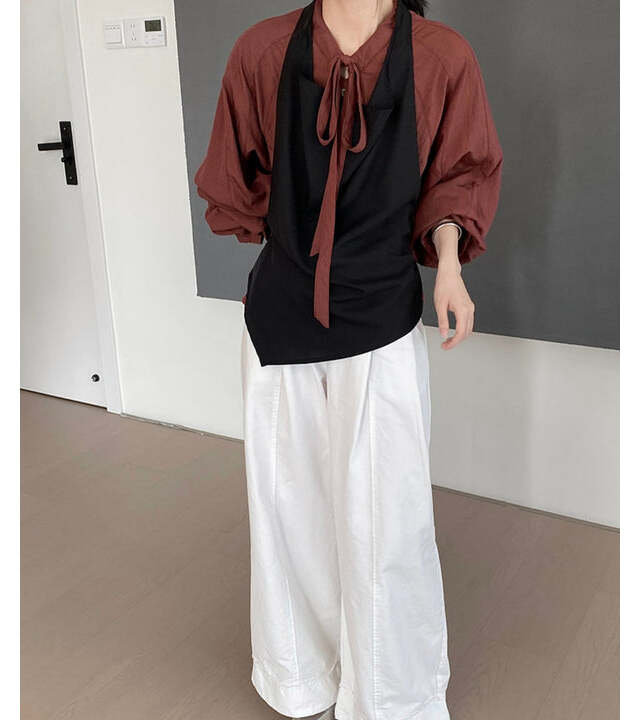 プレーンなショールをベスト風にアレンジした上級者コーデ。ベストよりも軽やかに、でもその存在感は抜群です。着慣れたブラウス&パンツのワンツーコーデもいつもとは違った表情に。ショールをかばんに忍ばせておけば、退勤後の急なお誘いにも慌てずにすみますね。