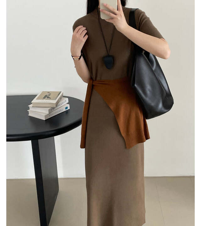 裾リブ付きのニットショールは、まるでカーディガンを腰に巻いているかのような雰囲気に。カーディガンをレイヤードするにはまだ暑いこの時期に嬉しいアイテムですね。ニットを重ねてもすっきり見えるワンピースが優秀。半袖と、タイトなシルエットが効いています。