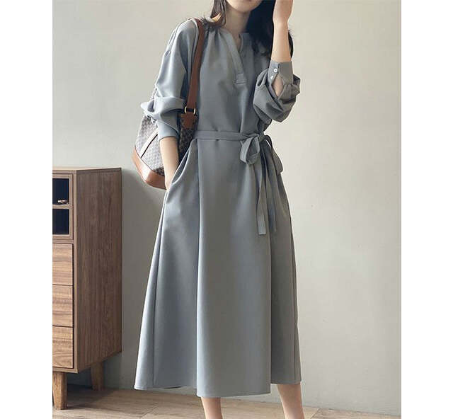 ウエストリボンでメリハリをつけつつ、スキッパーカラーが程よく抜け感を演出してくれるワンピース。