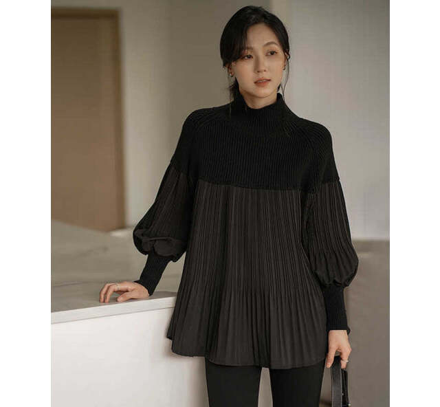異素材MIXとプリーツ加工が目を引くトップスは、シンプルな中にもこだわりが光る一枚。