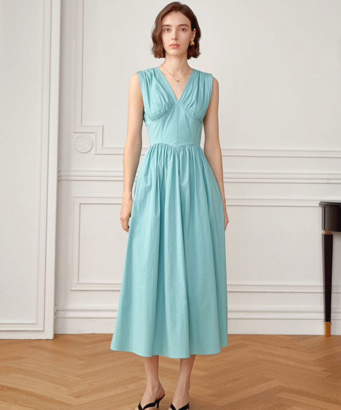 【エレガント】ターコイズブルー×ギャザーワンピース