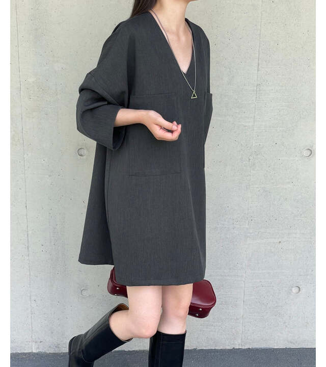 ロングブーツと言えばやっぱりショート丈が好相性。でもワンピースで丈も短めともなると可愛らし過ぎる?そんな風にためらう大人世代にも着やすい、シンプルでハンサムな1枚。大きめのポケットもマニッシュですね。パンツと合わせてチュニックとしても着用可能です。