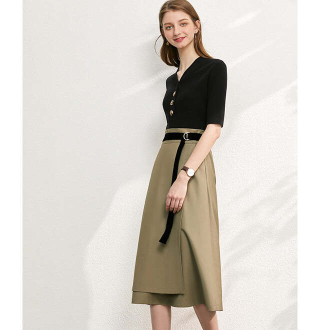 きれいなAラインシルエットに、ベルベットベルトとオリーブカラーのアクセントで、ほんのり季節感をプラス。