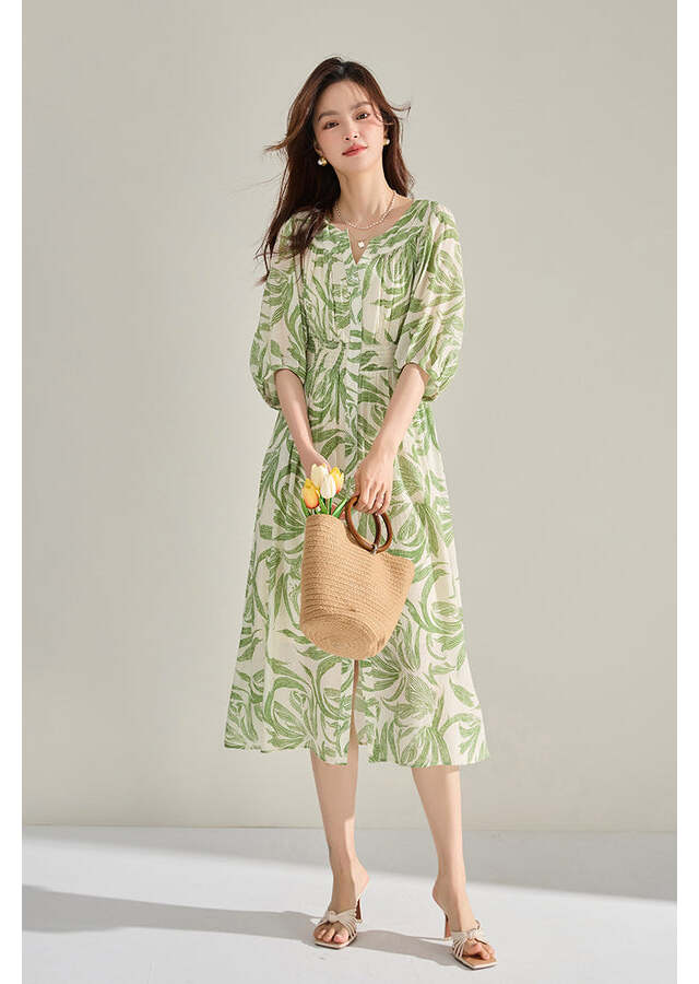 グリーンが爽やか!目を惹くリーフ柄ワンピ
