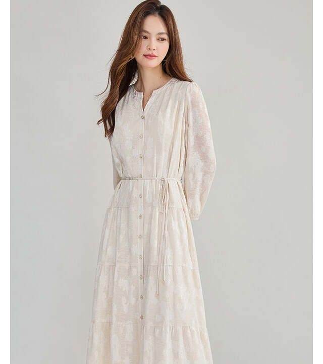 透け感あるシフォンジャカードが上品な七分袖ワンピ。ウエストマークでメリハリを出しつつ、ふんわりシルエットが体型カバー。ホワイトカラーで明るく抜け感たっぷりに。アクセなしでも映える繊細な生地感が魅力です。