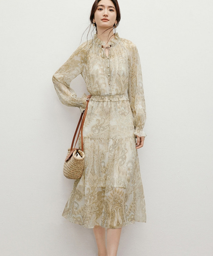 細やかなペイズリー柄が華やかで印象的な主役級ワンピース。透明感たっぷりの素材感と大人カラーで派手にならずにエレガントに決まります。