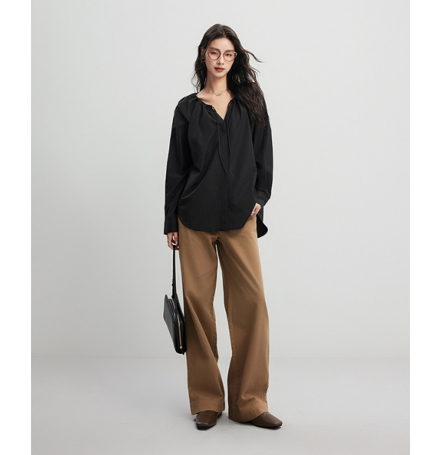 顔周りをすっきりと見せてくれるスキッパーネックの黒ブラウス。ゆったりとした身頃と前後差のあるヘムラインが気になる体型をさりげなくカバーしこなれた雰囲気を演出。ボトムスには柔らかなキャメルカラーのワイドパンツを合わせて大人の余裕を感じさせるアースカラーコーデに。ブラウスのフロントだけを少しインすれば脚長効果も。シンプルながらも計算されたデザインで着るだけでお洒落上級者に見える一枚。