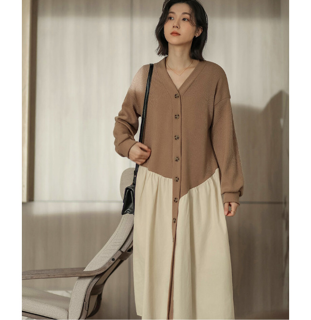 まるでカーディガンをレイヤードしているかのようなドッキングデザインが秀逸なワンピース。柔らかなニット素材と軽やかな布帛素材の組み合わせが一枚で奥行きのあるスタイルを完成。斜めに切り替えられたデザインが個性的でシンプルながらも周りと差がつくポイントに。ボタンを開けて羽織りとして着こなすこともできるので着こなしの幅がぐっと広がります。忙しい朝もコーデに悩まずさっと着るだけでお洒落が決まる頼れる味方。