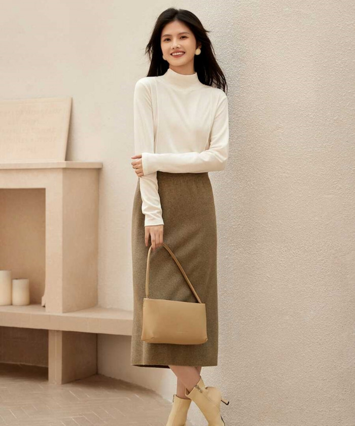 首元を優しく包み込むオフホワイトのハイネックカットソーに温かみのあるブラウンのウールスカートを合わせた品の良いきれいめスタイル。シンプルな組み合わせながらIラインを強調するシルエットがすっきりと洗練された印象に。トップスをインすることで腰の位置が高く見えスタイルアップ効果も。上質な小物を合わせれば美術館巡りや少しだけ特別な日のお出かけにも対応できるエレガントなコーディネートの完成。