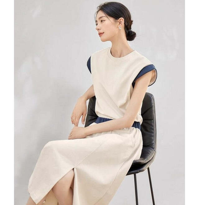 ベージュとネイビーのツートンカラーで洗練された印章になるセットアップワンピース。セットアップなので、上下別々でコーデができるのでコーデの幅も広がります。黒いバッグと合わせるとより大人っぽいコーデに。