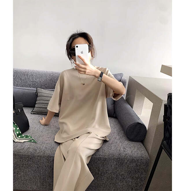 シンプルさを楽しめるセットアップ。コットン100%なので、肌触りが良い着心地です。ネックレスを身につけることで上品になります。黒い小物と合わせてメリハリのあるコーデに。