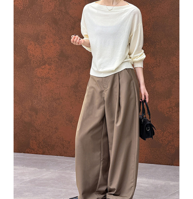 ボートネックのトラッド感ある着こなしと、オフショルにしてリラクシーに着こなす、二つのスタイルが楽しめます。