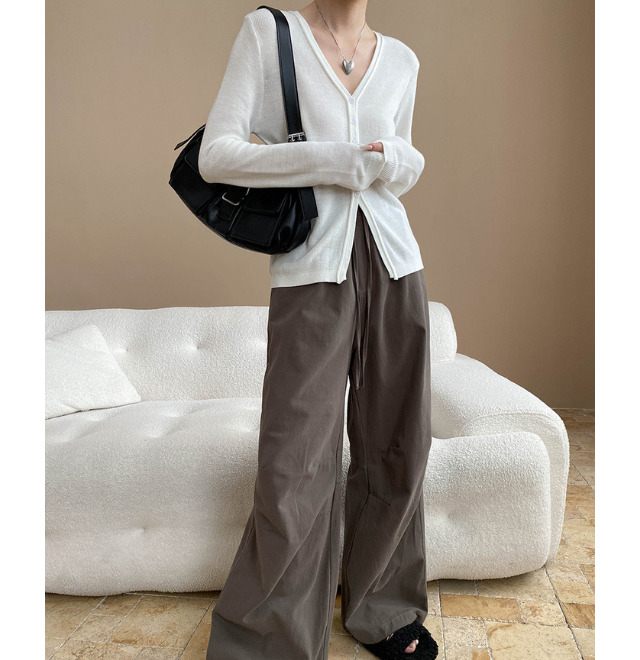 Vネックの細リブニットカーディガン。