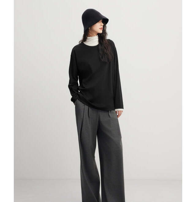 モノトーンコーデに大活躍のブラック。大きめサイズをチョイスして、インナーにタートルネックを仕込んだモードなコーデもおすすめ。