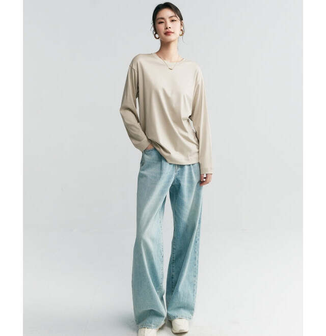 コットン100%の心地よさとシンプルなデザインで人気のコットンラウンドネックカットソー。白は爽やかに、黒は引き締めて、ベージュはナチュラルに、ピンクはフェミニンに、パープルで透明感を出して。カラーによって違った表情を楽しめます。