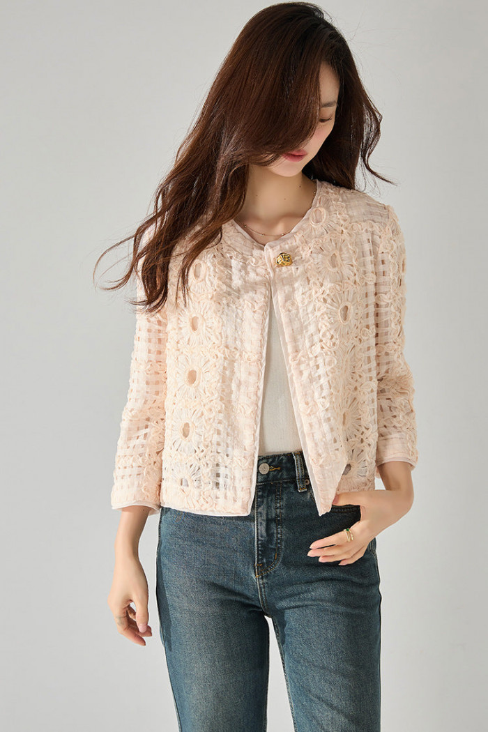 1枚でスタイリングを引き締めてくれるほどの力を持った、フラワーモチーフが女性らしいジャケット。着回しのしやすいベージュカラーで、どんなコーディネートにも対応できるのが嬉しいです。カジュアルな普段着にプラスするだけで印象を変えられるので、重宝できるのも嬉しいポイントです。
