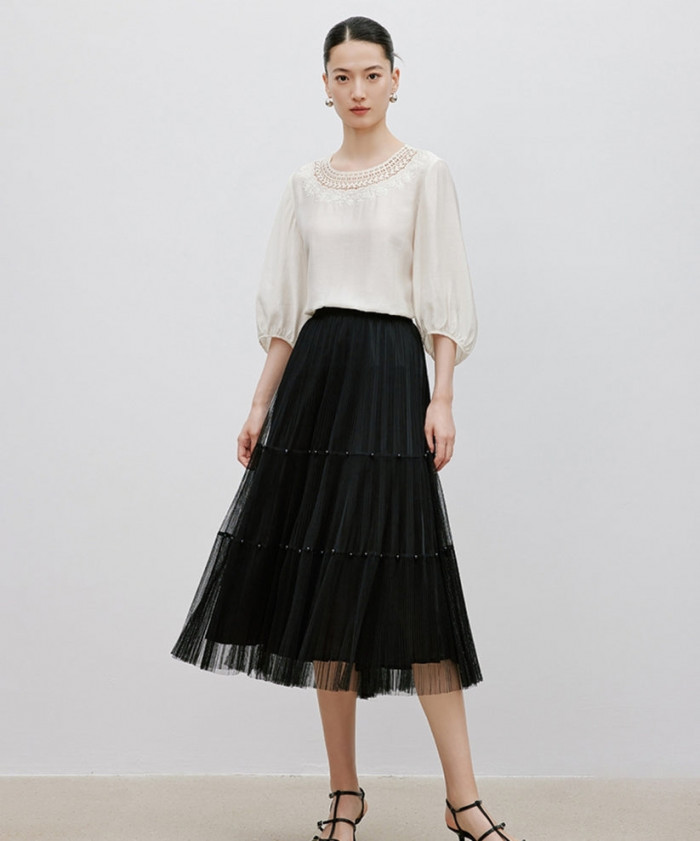 襟周りにクラシカルなデザインレースが施された、エレガントかつ洗練されたイメージのレースブラウス。レースのデザインは透かし編みのようなデザインなので、デコルテを程よく隠し程よく見せて抜け感を出してくれます。ふんわりとした袖が二の腕をカバーしてくれるのが嬉しいポイントです。