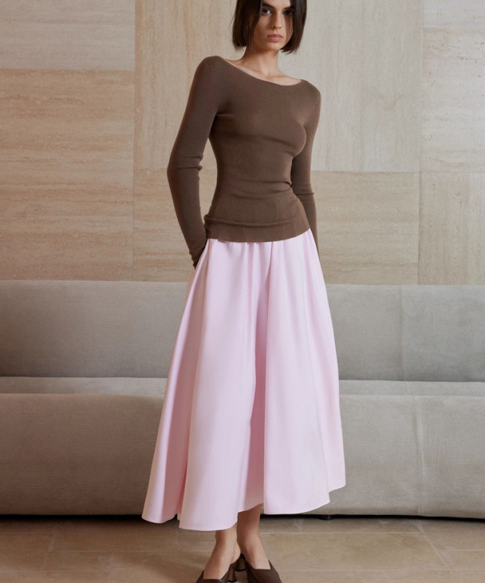 ふんわりとしたAラインのシルエットが非常に美しいピンクのスカート。可愛げのある淡いピンク・ふんわりと広がるAラインのシルエット・たっぷりのドレープ、と可愛らしいディテールが詰まっていますが、どれもシルエットの美しさのおかげで品が出て、美しくエレガントな雰囲気になるのです。