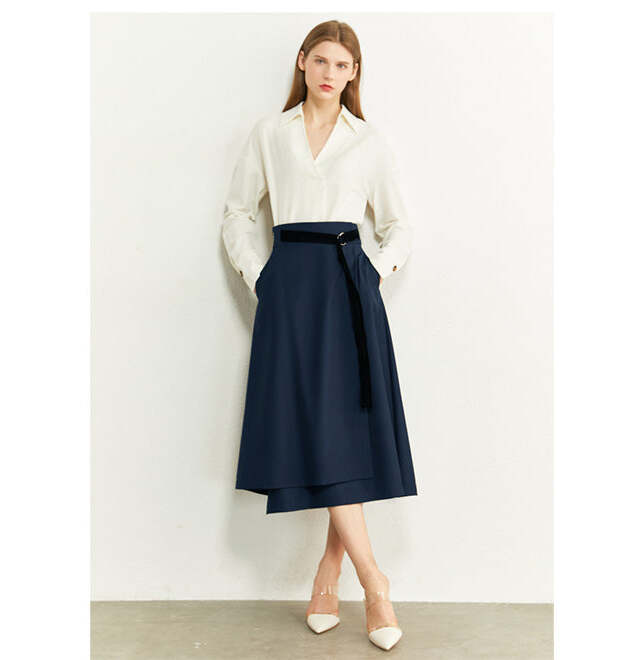 生地が重なり合うことによって、巻いているように見えるAラインシルエットの巻きスカート。深みのある大人っぽいロイヤルブルー×ブラックのベルトの組み合わせが、非常にセレブリティでエレガントな印象ですよね。トレンドのミモレ丈が、優雅でありつつもおしゃれさんに見せてくれるのです。