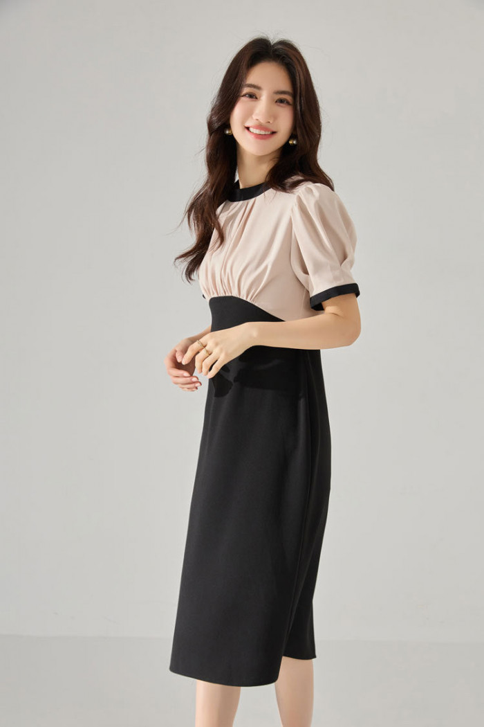 色のコントラストやディティールの甘辛バランスが、女性らしい魅力を引き出すワンピース。衿ぐりに施したタックがバストラインを美しく演出。胸の切り替え線は脇に向かってカーブしているため、上半身を華奢に見せてくれます。ボリュームのあるパフスリーブは、袖口タックで甘さを引き締めて。後ろ衿ぐりで結ぶリボンが、シンプルなバックスタイルの可愛らしいアクセントになっています。