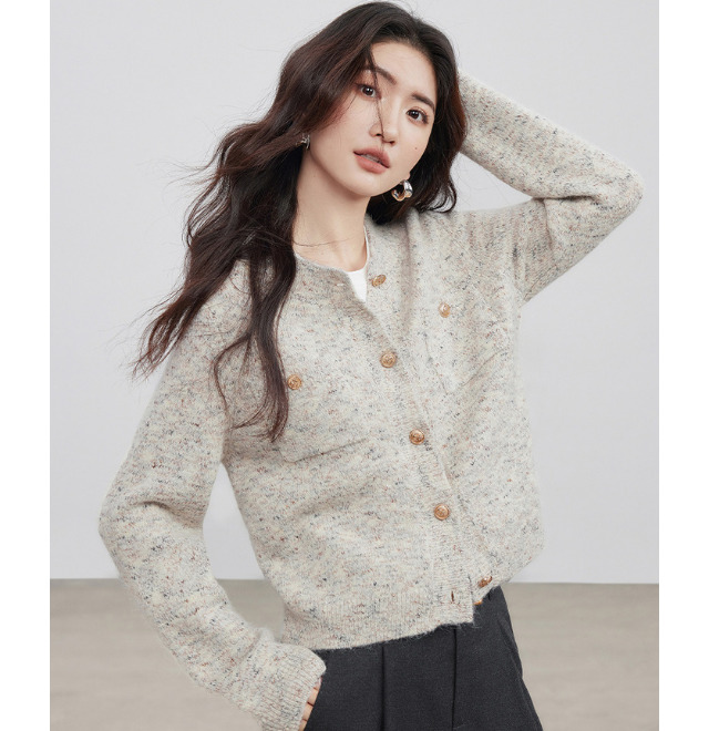 ゴールドボタンがアクセントのラウンドネックのカーディガン。