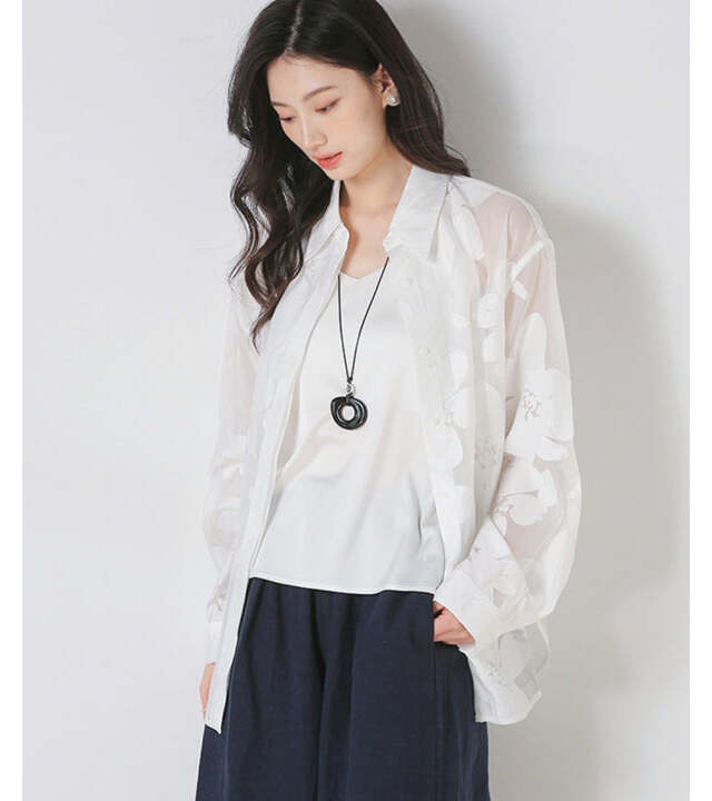 - 【アラフィフの上品夏スタイル】シースルーフラワージャガードシャツで涼やかな華やぎをプラス