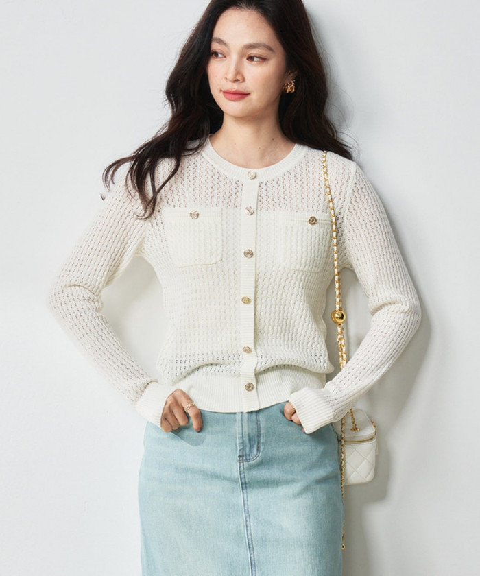 涼しげな透かし編みが特徴のポケット付きカーディガンは、夏のお出かけや冷房対策に最適な一枚。ほどよい透け感が軽やかで、アラフィフ世代の上品な大人らしさを演出してくれます。前立てやポケットにあしらわれたゴールドボタンが華やぎを添え、シンプルなインナーに羽織るだけで洗練された雰囲気に。リネン混ワイドパンツやタイトスカートと組み合わせれば、オンにもオフにも対応可能です。ホワイトやベージュのインナーと合わせれば清涼感が増し、アクセントにカラーパンツやスカーフをプラスすることで、夏らしい大人のコーディネートが完成します。