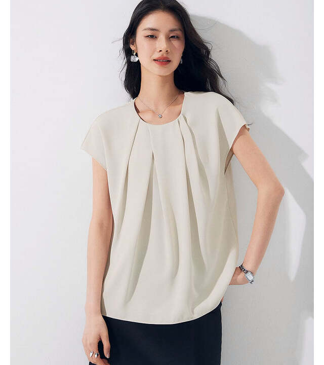 暑い季節でもだらしなく見えない、きちんと感のある夏コーデにはプリーツパターンドレープブラウスが最適です。襟ぐりのプリーツが顔まわりを華やかに演出し、フレンチスリーブで腕まわりはすっきり。ハリのある素材が体のラインを美しく整え、上品さを保ちつつ涼しげな印象に仕上がります。オフィスやちょっとしたお出かけにもぴったりで、夏のきちんと見せコーデに欠かせない一枚です。