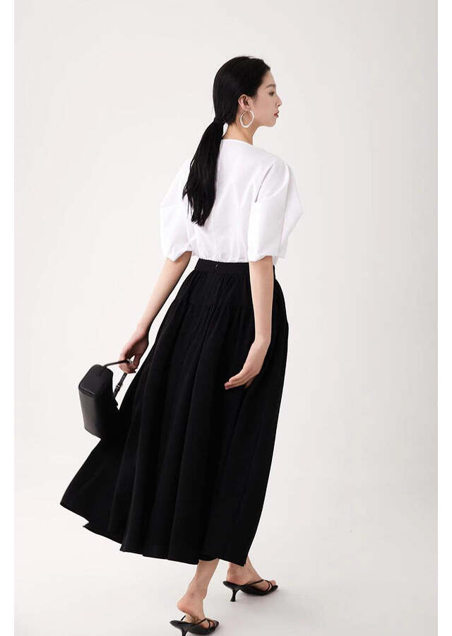 - ブラックフレアで上品さを演出!夏でもフォーマル感あるロングスウィングスカートコーデ
