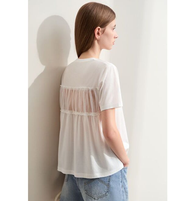 夏のカジュアルコーデはつい平凡になりがちですが、バッグレースロゴTシャツなら後ろ姿で差がつきます。一見シンプルなロゴTシャツですが、背面の透け感素材とシャーリングの切り替えが、さりげなく女性らしさと奥行きをプラス。異素材コンビネーションの効果で、シンプルなボトムとの組み合わせでも立体感のあるコーデに仕上がります。ショートパンツやデニム、スカートとのレイヤード次第で幅広く活躍するアイテムです。