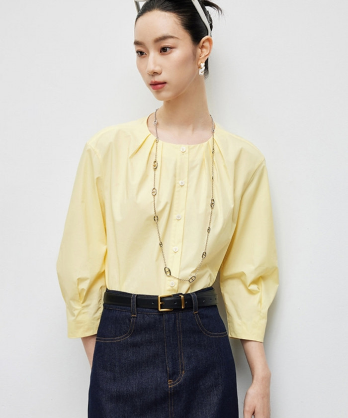 パステルイエローのようなクリームカラーが目をひく1枚。ランタンスリーブと襟元のギャザーデザインが洗練された雰囲気を後押し。絶妙な長さの丈なので、インスタイルもアウトスタイルもお手のもの。