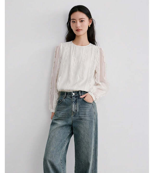 お袖のシアー感とスカラップレースデザインが魅力のこちらのブラウス。ホワイトに近いベージュで、どんなカラーのデニムとも相性抜群です。