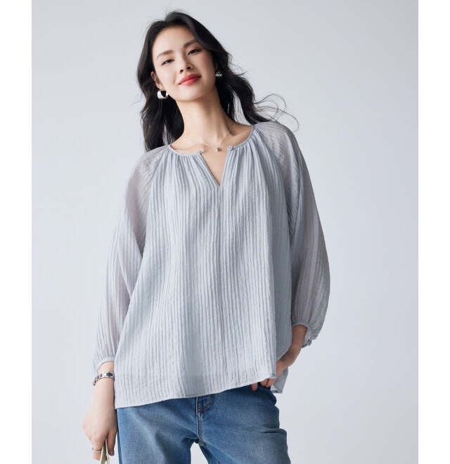 柔らかな質感とVネックが女性らしいこちらのブラウス。くすんだライトブルーがどんなデニムにもマッチし、こなれたワントーンコーデが簡単にできあがります。シルバーアクセサリーで透明感を引き立てて。