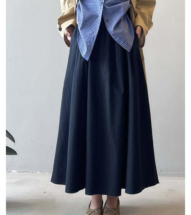 ウエスト位置を高く見せて、自然に脚長効果が叶うAラインスカート。深みのあるネイビーは秋らしく落ち着いた雰囲気を演出してくれます。シャツやニットと合わせれば、オンオフどちらにも対応できる万能アイテム。
