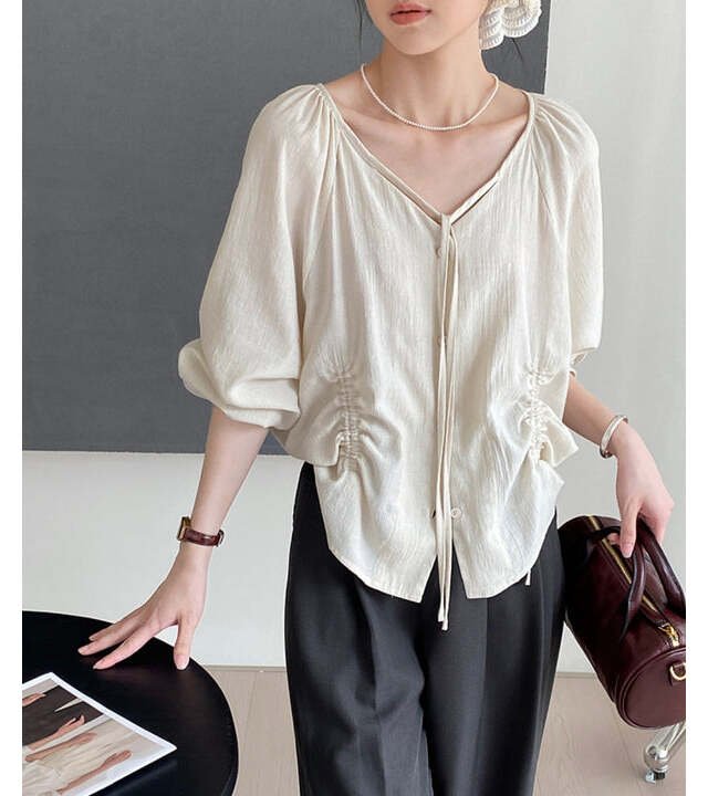 抜け感たっぷり。ドローストリングで差がつく白ブラウス