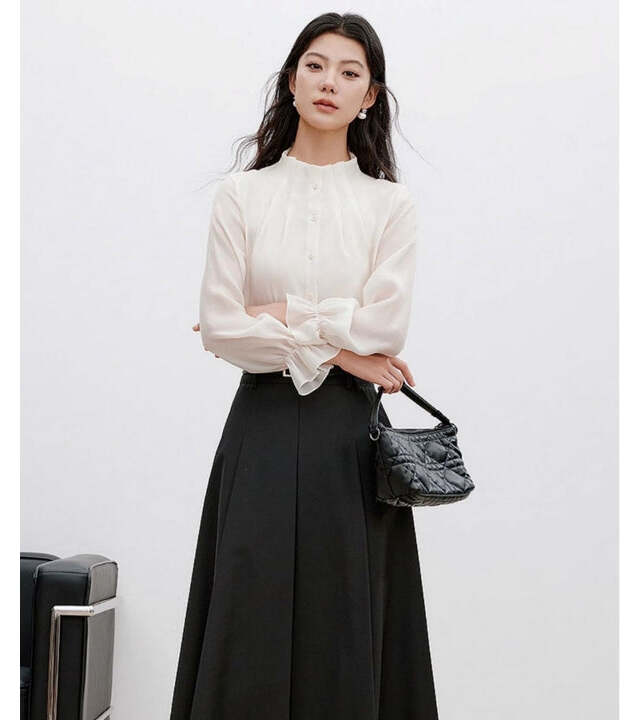 首元と袖口の繊細なフリルが、ふとした仕草まで美しく見せる一着。ボリュームのあるボトムと合わせてクラシカルに演出。ハレの日の装いにも使える万能ブラウスです。